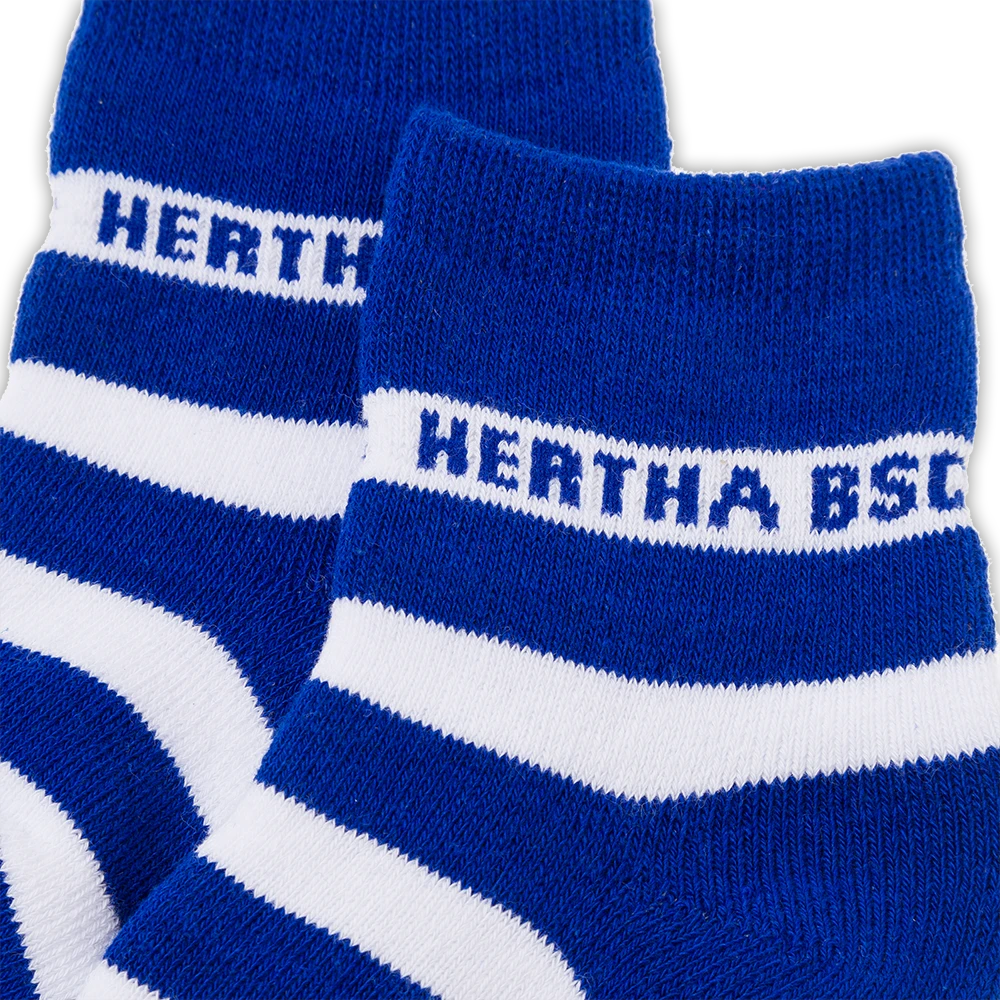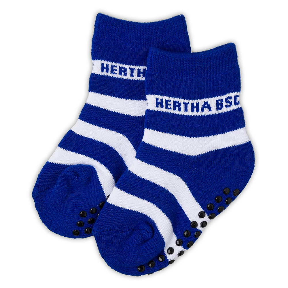 Blau-weiß gestreifte Babysocken mit Anti-Rutsch-Noppen und Hertha BSC Schriftzug.