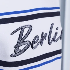 Mit diesem femininen Frauen Kapuzenpulli stellst du starke Outfits zusammen. Der angenehme Weißton und ein Berlin Schriftzug stellt zusammen mit den blauen und schwarzen Streifen einen schlichten aber optisch starken Pullover dar.