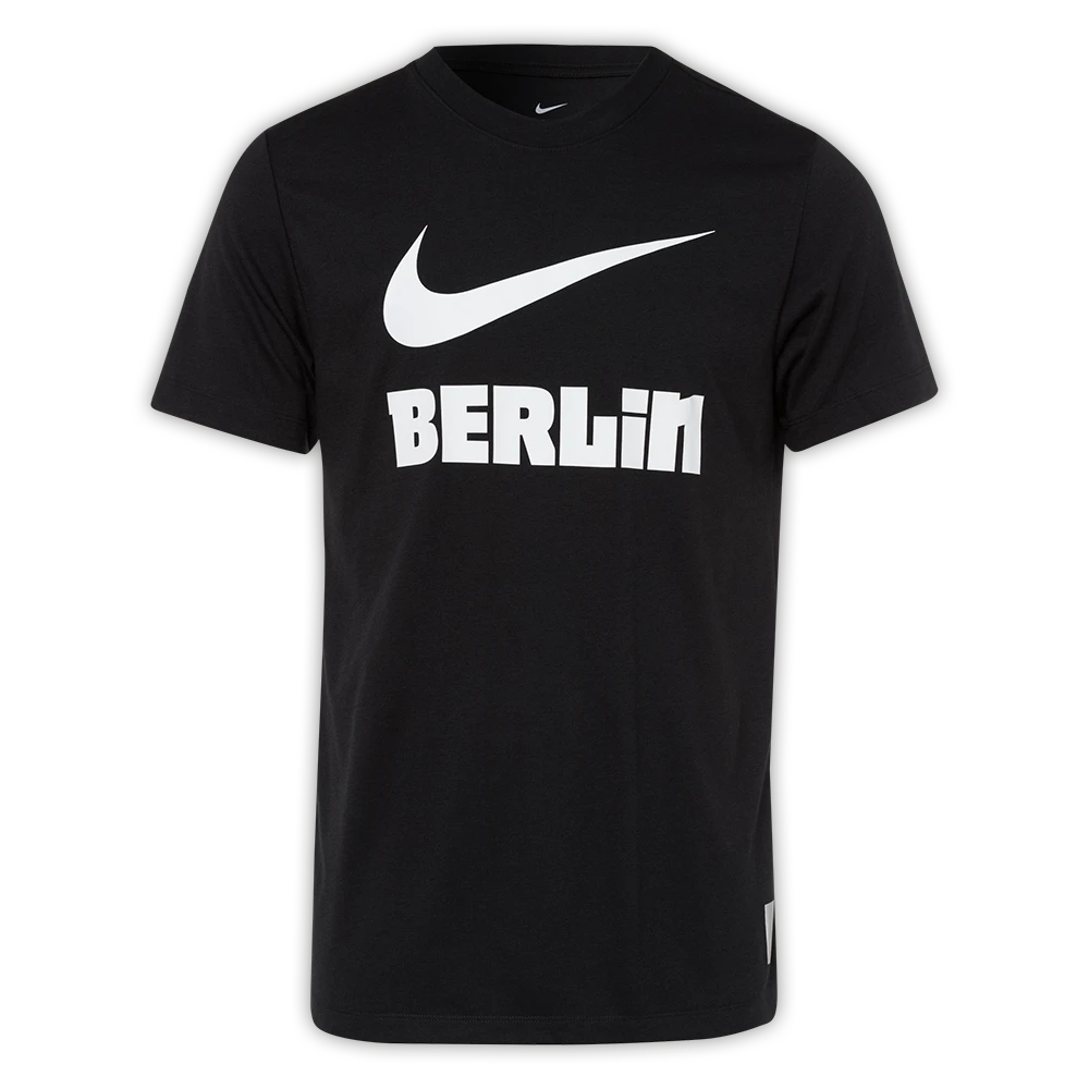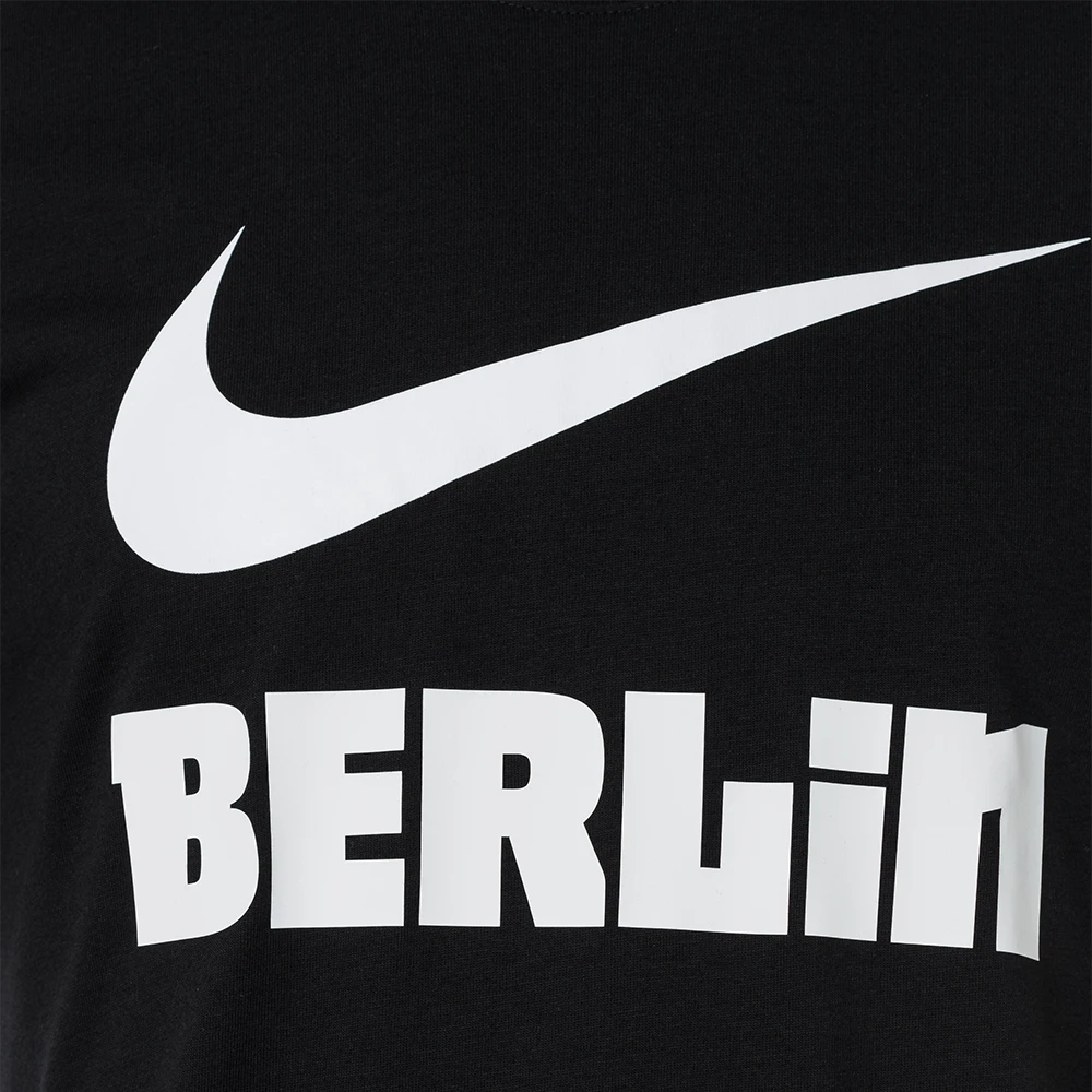 Du suchst ein sportliches T-Shirt, welches aber dennoch ein Statement zu deiner Stadt und deinem Verein setzt? Dann ist dieses in schwarz gehaltene T-Shirt mit auffälligen Nike Swoosh und BERLIN Schriftzug genau die richtige Wahl für dich.