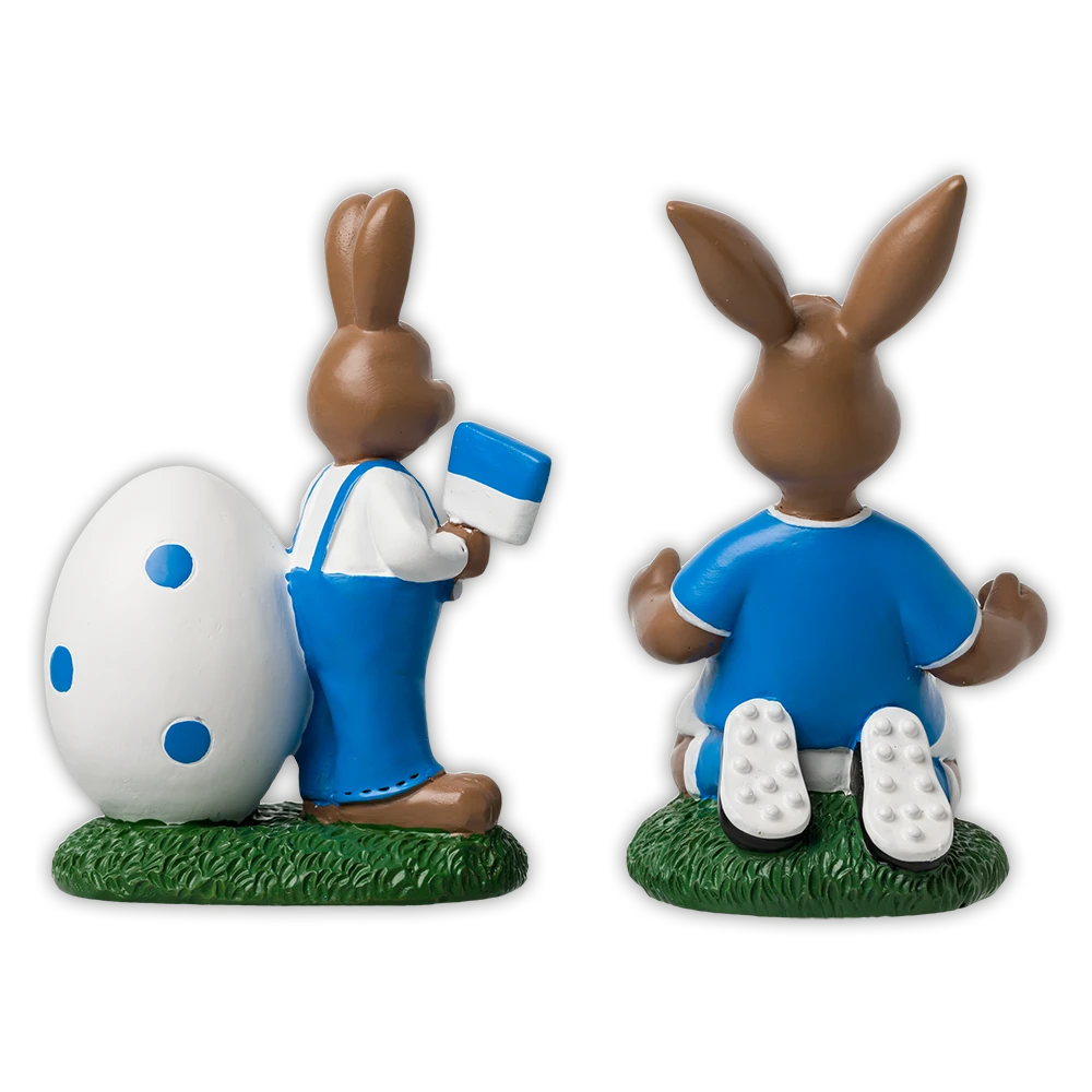 Hergestellt aus Polyresin, sind diese Figuren langlebig und können jedes Jahr wieder verwendet werden. Das Set enthält zwei Hasen, die das Hertha BSC-Logo tragen und in den Vereinsfarben Blau und Weiß gestaltet sind.