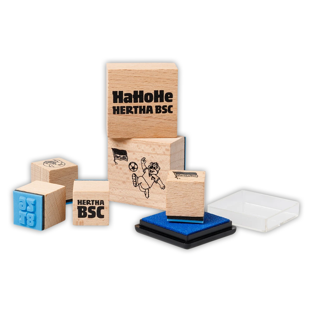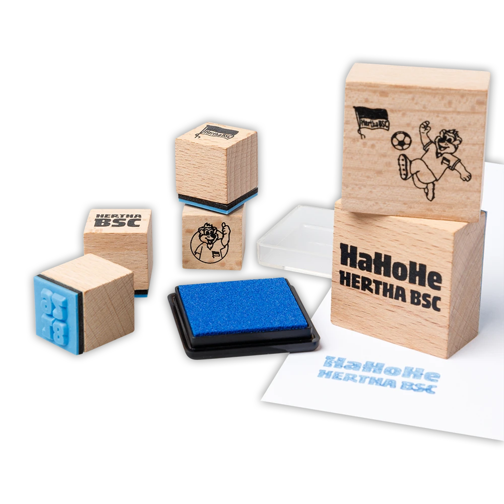 In dem Stempelset sind 6 verschiedene Stempel und ein Stempelkissen mit blauer Farbe enthalten.