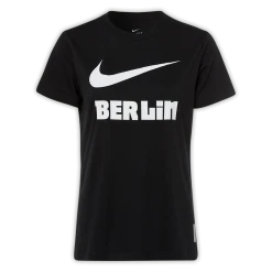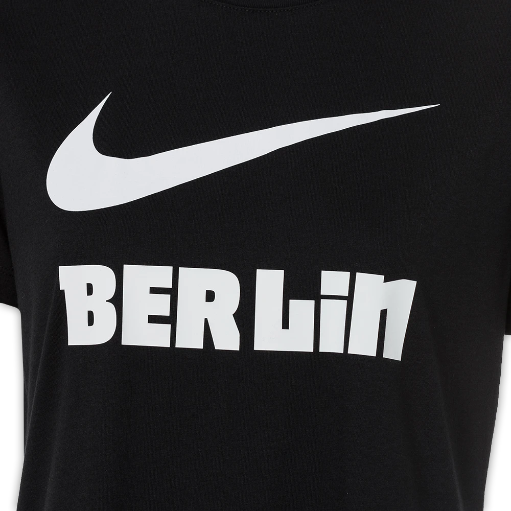 Du suchst ein sportliches T-Shirt, welches aber dennoch ein Statement zu deiner Stadt und deinem Verein setzt? Dann ist dieses in schwarz gehaltene T-Shirt mit auffälligen Nike Swoosh und BERLIN Schriftzug genau die richtige Wahl für dich.